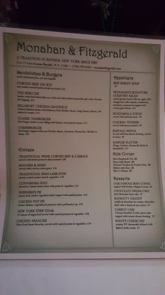 Welcome to Monahan & Fitzgerald, a vibrant American eatery located at 214-17 41st Ave, Bayside, NY. Setting a casual tone with moderate noise, this establishment is perfect for gatherings—be it family dinners or late-night meetups with friends. Renowned for its welcoming atmosphere, Monahan’s offers a range of utilities including takeout, delivery, and outdoor seating, catering to diverse dining preferences.